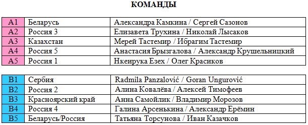 19:00 (15:00 мск) Россия 4 (Арсенькина/Ерёмин) – Беларусь/Россия (Торсунова/Казачков)