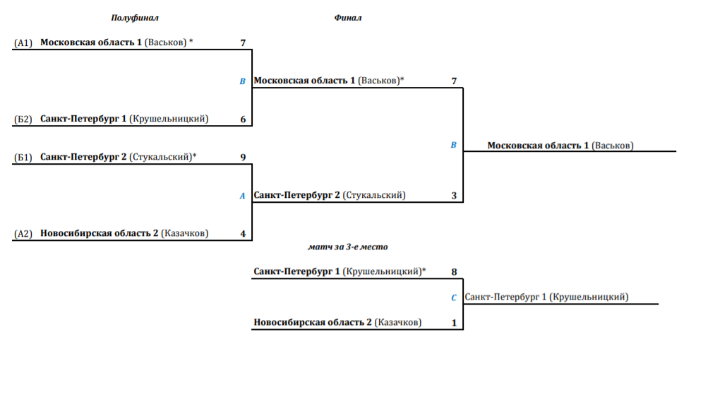полуфиналы: в финал вышли команды - Санкт-Петербург 2 (Стукальский) и Московская область 1 (Васьков), в матче за третье место встретятся команды - Санкт-Петербург 1 (Крушельницкий) и Новосибирская область 2 (Казачков)
