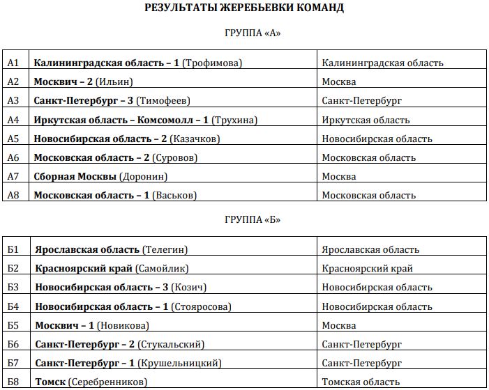 1 тур: Группа А - с побед стартовали команды - Москвич 2 (Ильин), Комсомолл 1 (Трухина), Новосибирская область 2 (Казачков) и Московская область 1 (Васьков)