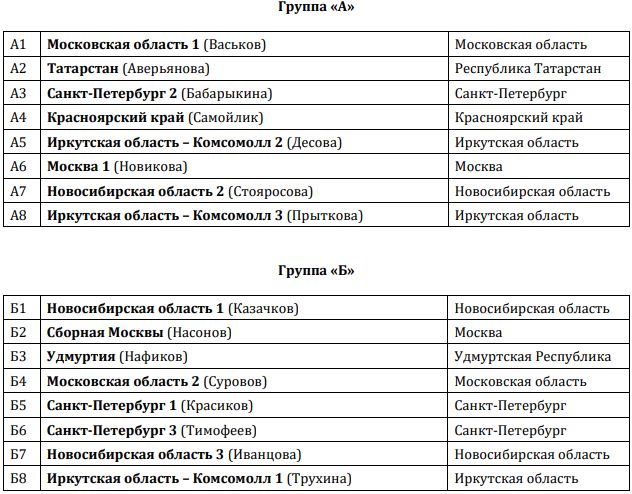 1 тур: группа А - с побед стартовали команды - Московская область 1 (Васьков), Красноярский край (Самойлик), Москва 1 (Новикова) и Новосибирская область 2 (Стояросова)