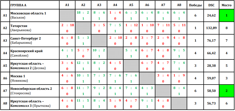 7 тур: группа А - по четыре победы у команд - Московская область 1 (Васьков) и Новосибирская область 2 (Стояросова), по три победы у команд - Красноярский край (Самойлик) и Москва 1 (Новикова)