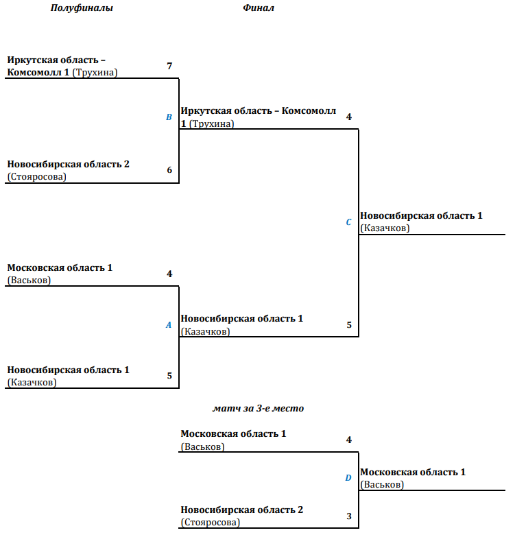 полуфиналы: в финал вышли команды - Комсомолл 1 (Трухина) и Новосибирская область 1 (Казачков), за третье место поборются - Московская область 1 (Васьков) и Новосибирская область 2 (Стояросова)